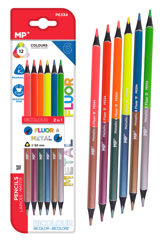 MP σετ χρωματιστές ξυλομπογιές με διπλή μύτη PE334, 3mm μύτη, τρίγωνες, φθορίζοντα & μεταλλικά χρώματα, 6τμχ