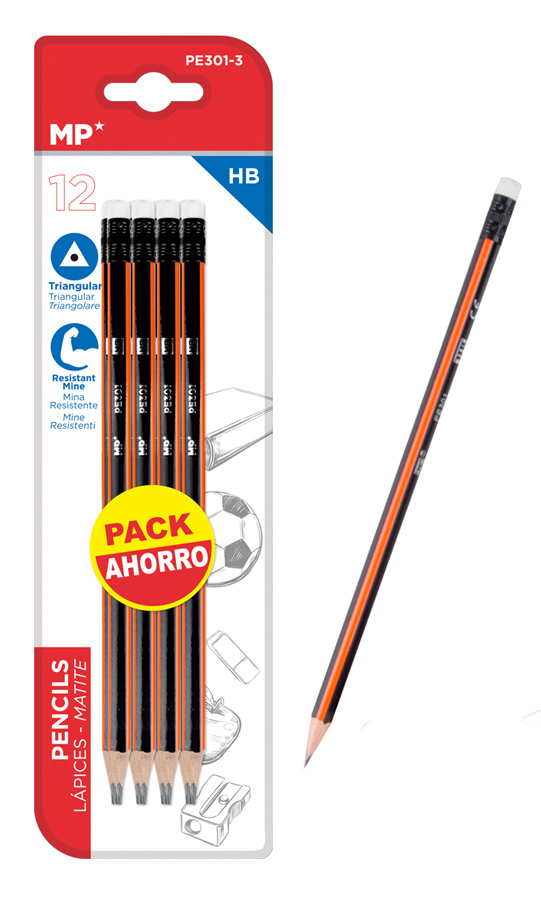MP ξύλινο μολύβι με γόμα PE301-3, τρίγωνο, HB, 12τμχ
