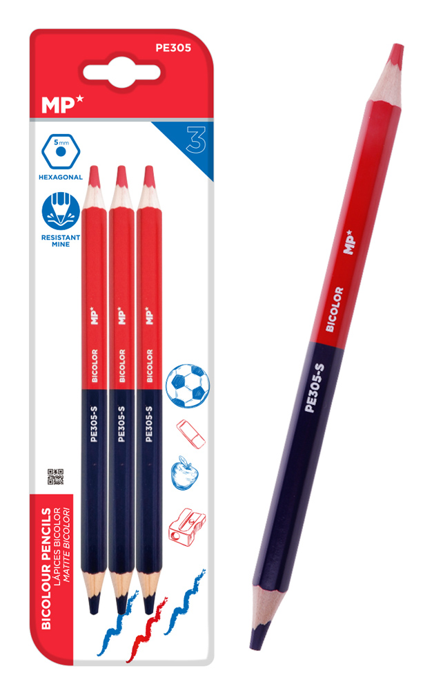 MP ξυλομπογιά με διπλή μύτη PE305, 5mm μύτη, εξάγωνο, μπλε/κόκκινο, 3τμχ