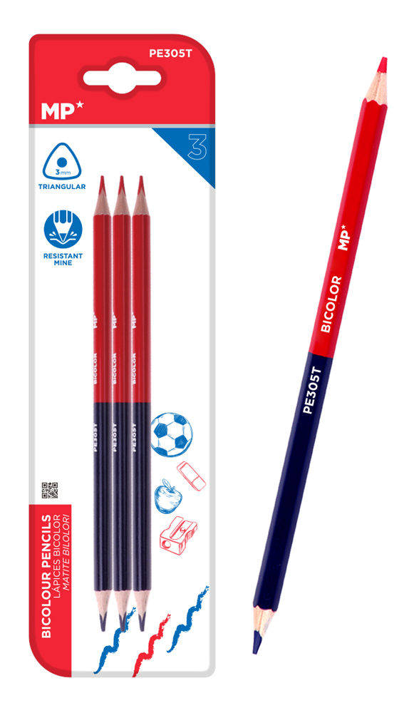 MP ξυλομπογιά με διπλή μύτη PE305T, 3mm μύτη, τρίγωνο, μπλε/κόκκινο, 3τμχ